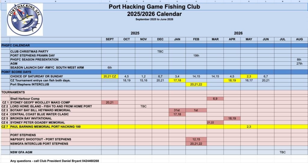 During the fishing season, Club Point Score Days are held twice a month (1st and 3rd weekends of the month), with members being able to elect either Saturday or Sunday to fish.